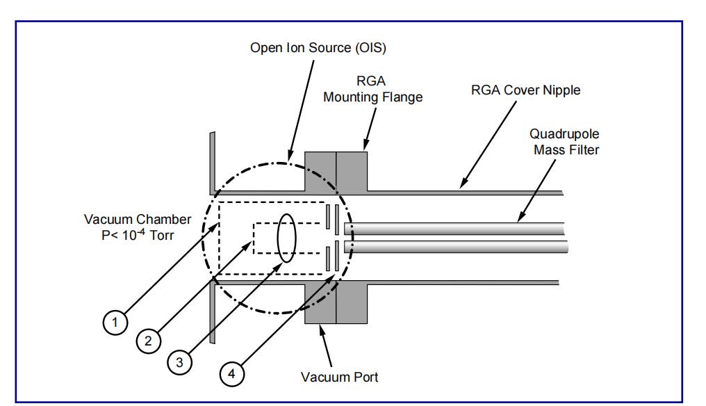 在大多數(shù)商用RGAs中使用的標(biāo)準(zhǔn)離子源是開(kāi)放離子源(OIS)。這種電離器被認(rèn)為是RGA的“全做”源。自20世紀(jì)50年代初以來(lái),它就一直呈圓柱形,軸向?qū)ΨQ(chēng)的形式存在。通用的OIS設(shè)計(jì)原理圖如圖1所示。