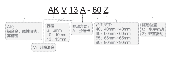 AKV系列鋁合金高精密手動升降滑臺命名規(guī)則: