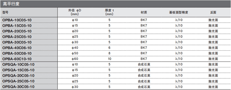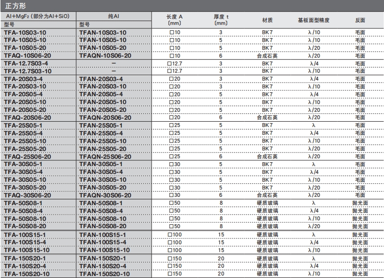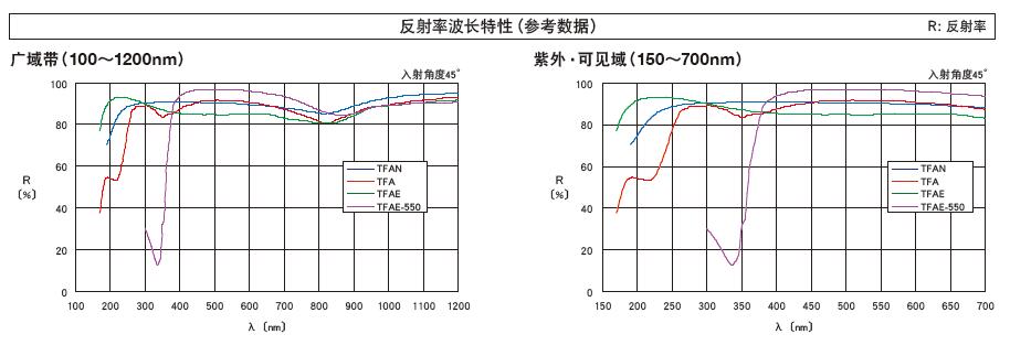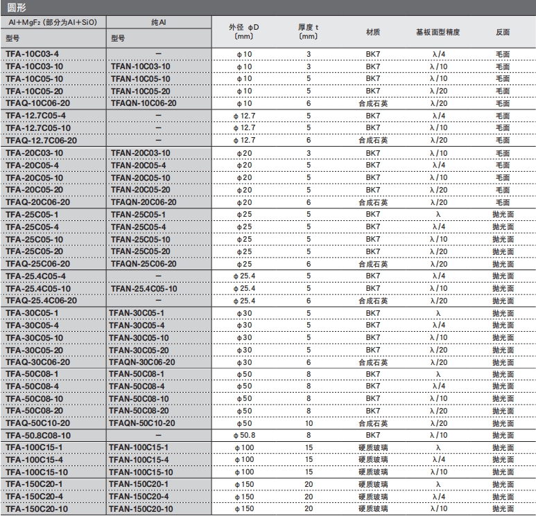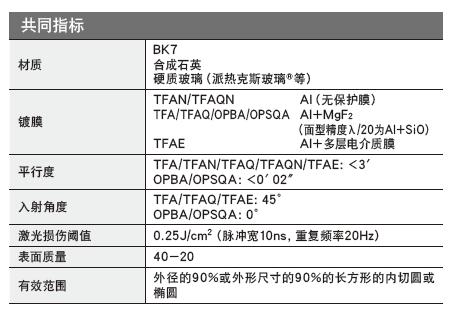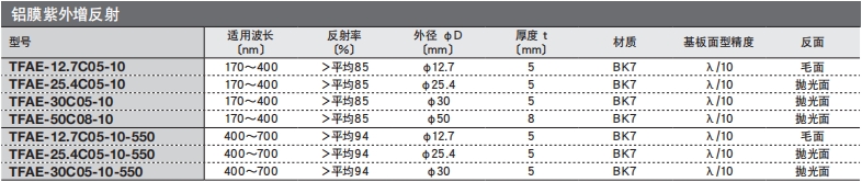 · 有只蒸鍍鋁膜的(TFAN/TFAQN),和為防止損傷在鋁膜上鍍有保護(hù)膜的(TFA/TFAQ),為提高紫外光反射率鍍有保護(hù)膜的(TFAE) 和在平行平面基板上鍍有保護(hù)膜的鋁膜反射鏡(OPBA/OPSQA)四種類型。