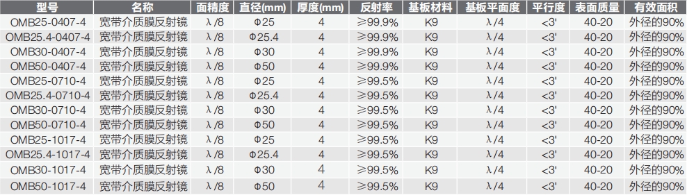 1. OMB系列可見(jiàn)光寬帶介質(zhì)膜反射鏡(Optical Mirror: Broadband):