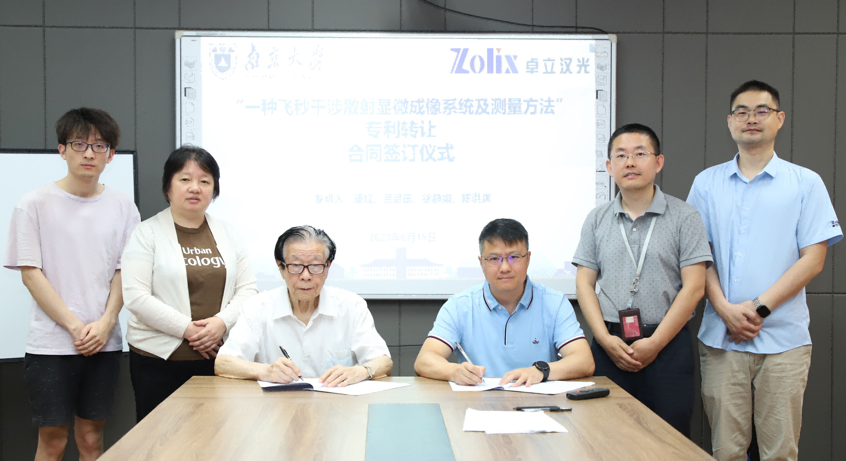 2023年6月15日,卓立漢光集團(tuán)董磊副總經(jīng)理帶領(lǐng)研發(fā)團(tuán)隊(duì)拜訪(fǎng)南京大學(xué)陳洪淵院士團(tuán)隊(duì),在南京大學(xué)仙林校區(qū)化學(xué)樓隆重舉行了“一種飛秒干涉散射顯微成像系統(tǒng)及測(cè)量方法”**轉(zhuǎn)讓的簽約儀式。