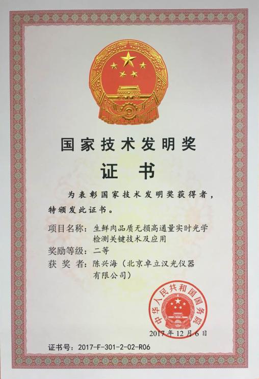 我司技術(shù)總經(jīng)理陳興海與中國農(nóng)業(yè)大學彭彥昆教授合作完成的“生鮮肉品質(zhì)無損高通量實時光學檢測關(guān)鍵技術(shù)及應用”獲得國家技術(shù)發(fā)明二等獎。