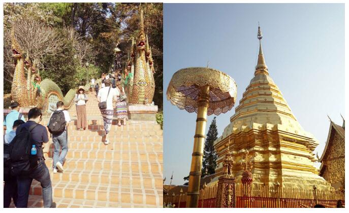 第四天來(lái)到位于素貼山上的雙龍寺一游。雙龍寺是佛教避暑勝地,它是一座由白象選址、皇室建造,充滿傳奇色彩的廟宇, 沿著306個(gè)臺(tái)階攀登而上來(lái)到泰北的地標(biāo)“雙龍寺”,寺內(nèi)金璧輝煌,香火鼎盛,寺廟里埋有佛主的舍利子,是虔誠(chéng)佛教信徒向往朝拜的地方。也可以在觀望臺(tái)居高臨下遠(yuǎn)眺清邁市全景。