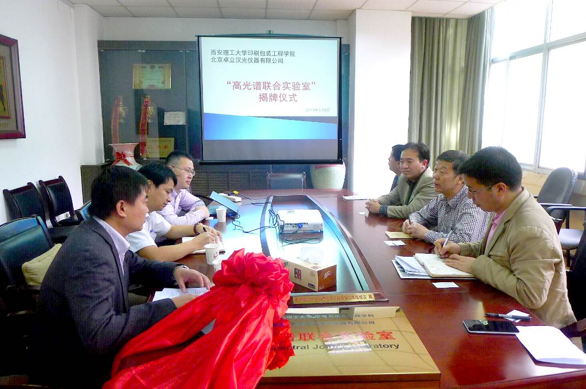 2015年5月8日上午,西安理工大學(xué)印刷包裝工程學(xué)院與北京卓立漢光儀器有限公司簽訂了“高光譜聯(lián)合實(shí)驗(yàn)室”建設(shè)合作協(xié)議并舉行了揭牌儀式。北京卓立漢光儀器有限公司代表張恒總經(jīng)理、李軍武經(jīng)理、陳松經(jīng)理,印刷包裝工程學(xué)院繆亞林副院長(zhǎng)、信號(hào)與信息處理學(xué)科帶頭人張二虎教授、康曉兵、陳亞軍、李維老師等人出席了本次會(huì)議。