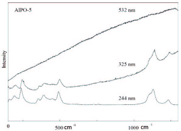 分別采用244nm、325nm、532nm 激光器實測樣品(AIPO-5 分子篩),可清楚看到紫外拉曼光譜在規(guī)避熒光干擾信號的良好表現(xiàn)。