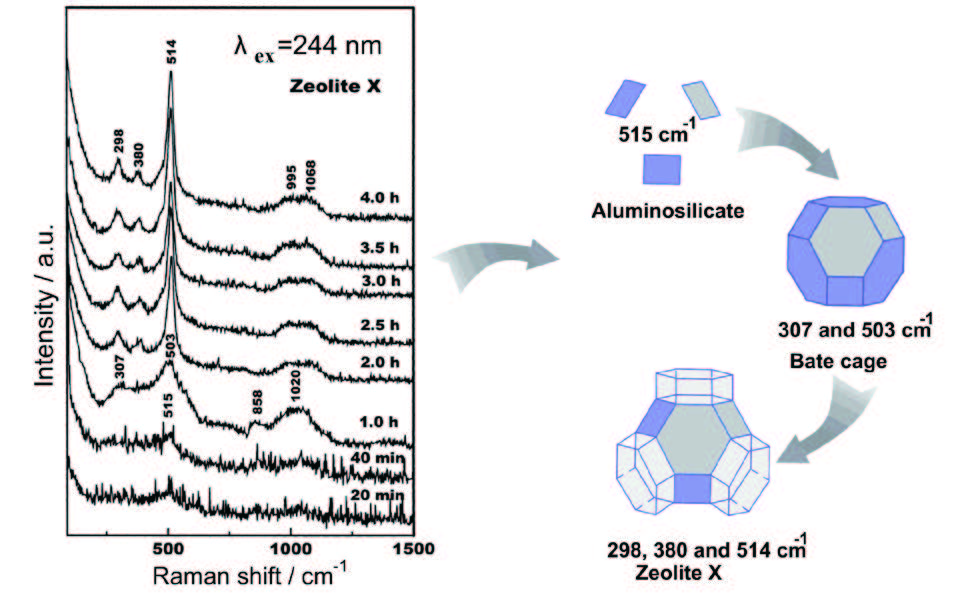 利用紫外拉曼避開熒光和增加靈敏度的特點, 可以對分子篩合成過程中的合成前體、中間物以及分子篩晶體 的演化過程進行研究。