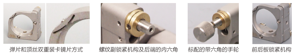 • 雙重鎖緊機(jī)構(gòu):不僅螺紋副帶鎖緊機(jī)構(gòu)(除12.7鏡架外),前后板設(shè)計(jì)也有可鎖緊的螺紋孔;